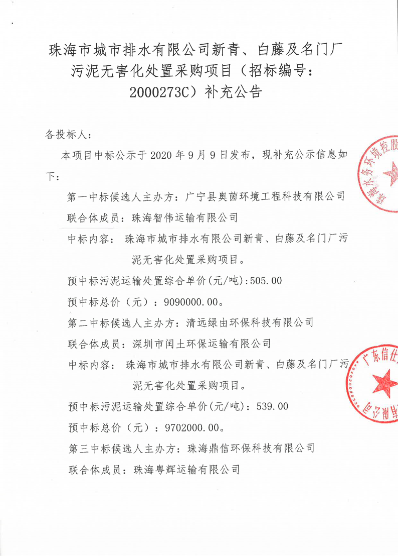 珠海市城市排水有限公司新青、白藤及名門廠污泥無害化處置采購項(xiàng)目補(bǔ)充公告