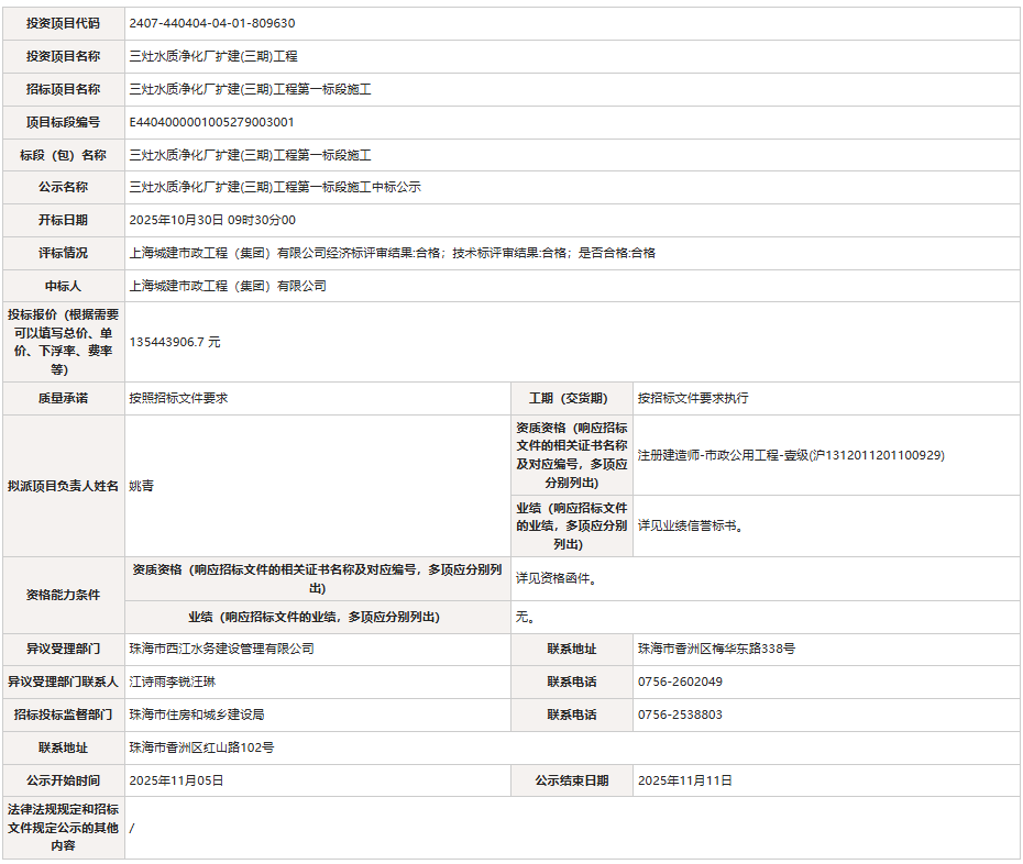 三灶水質(zhì)凈化廠擴建(三期)工程第一標(biāo)段施工中標(biāo)公示